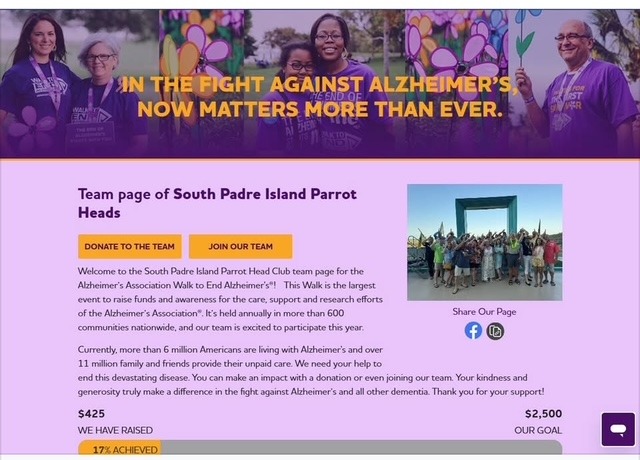 It is a tradition for Parrot Head Clubs to join their nearest Walk to End Alzheimer's, sponsored by the Alzheimer's Association. This is worth crossing the causeway to do, I promise! I participated in numerous ALZ walks with my previous club. It's always a fun, uplifting event. It is NOT an athletic competition – some people actually walk pushing walkers or strollers. The area where we walk near the Events Center in Brownsville is just gorgeous. There are vendors with goodies, free photo booth, lively music to motivate us. Please join! I'm attaching the link to our Team Page, where you can register and/or make a donation to Alzheimer's Association. If your schedule conflicts, please consider making a donation to our team on this page.