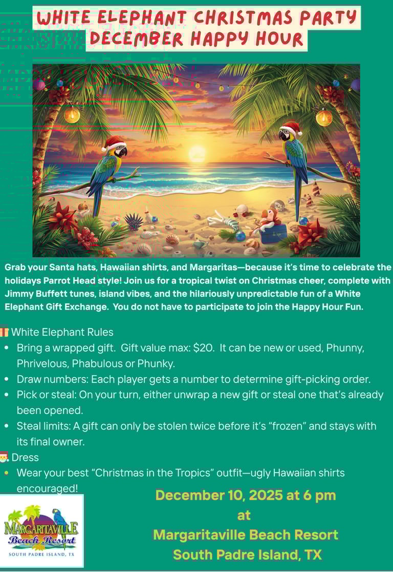 Bursting with color, feathers, and J Micheal Laferty! Parrot Heads were dancing, laughing, and spreading joy all around. Huge thanks to J. Micheal Laferty for keeping the party going with Christmas tunes and for everyone who joined in the phun!!