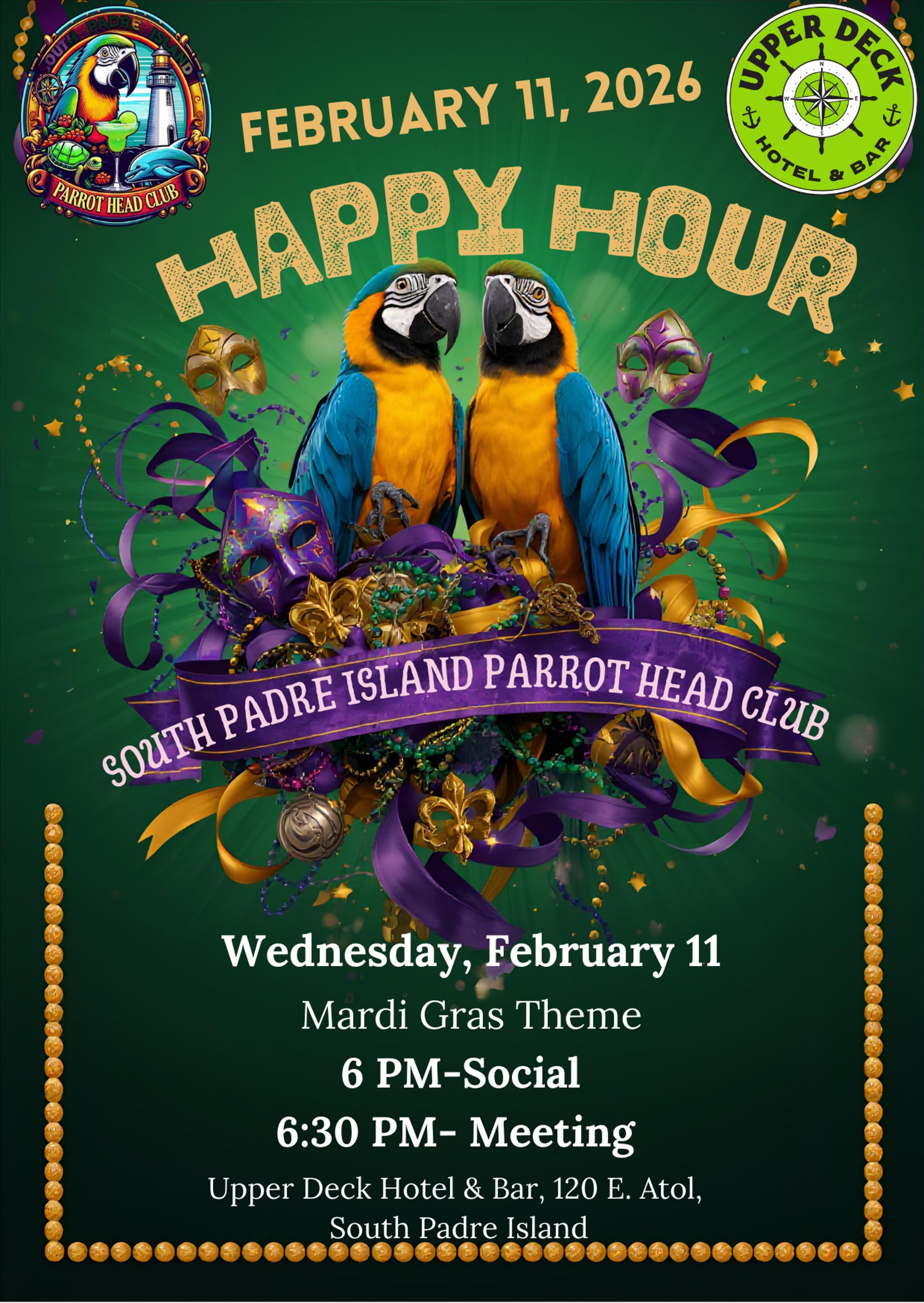 February Happy Hour is about to get WILD in the best way! We’re taking the party to the always‑fun, always‑welcoming Upper Deck Hotel & Bar and we’re rolling in with a full‑on Mardi Gras celebration!